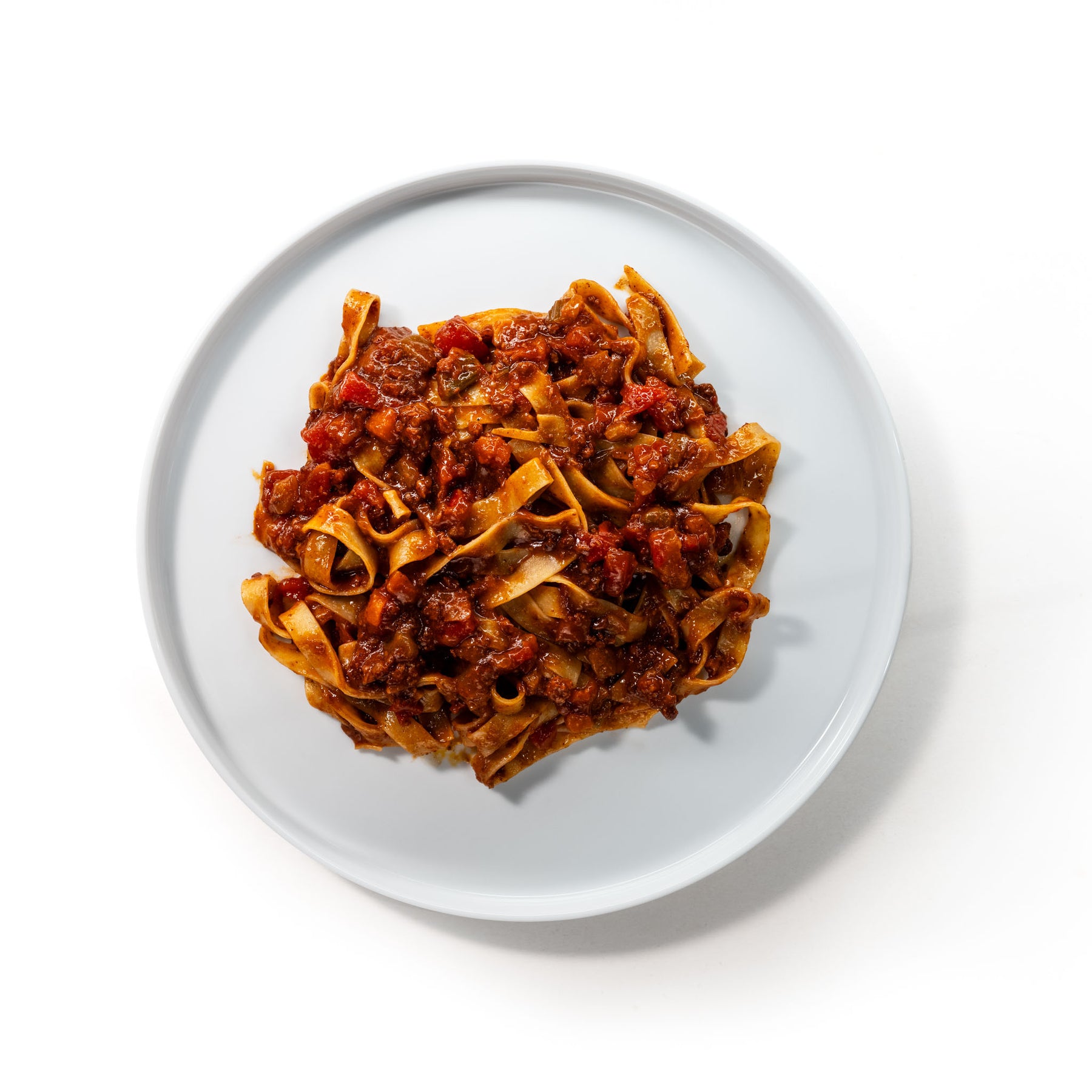 Neben dem Soffritto aus Staudensellerie, Karotte und Zwiebel, verwenden wir Rinderschulter, hausgemachten Pancetta, Rotwein, italienische Tomaten und natürlich viel Zeit.