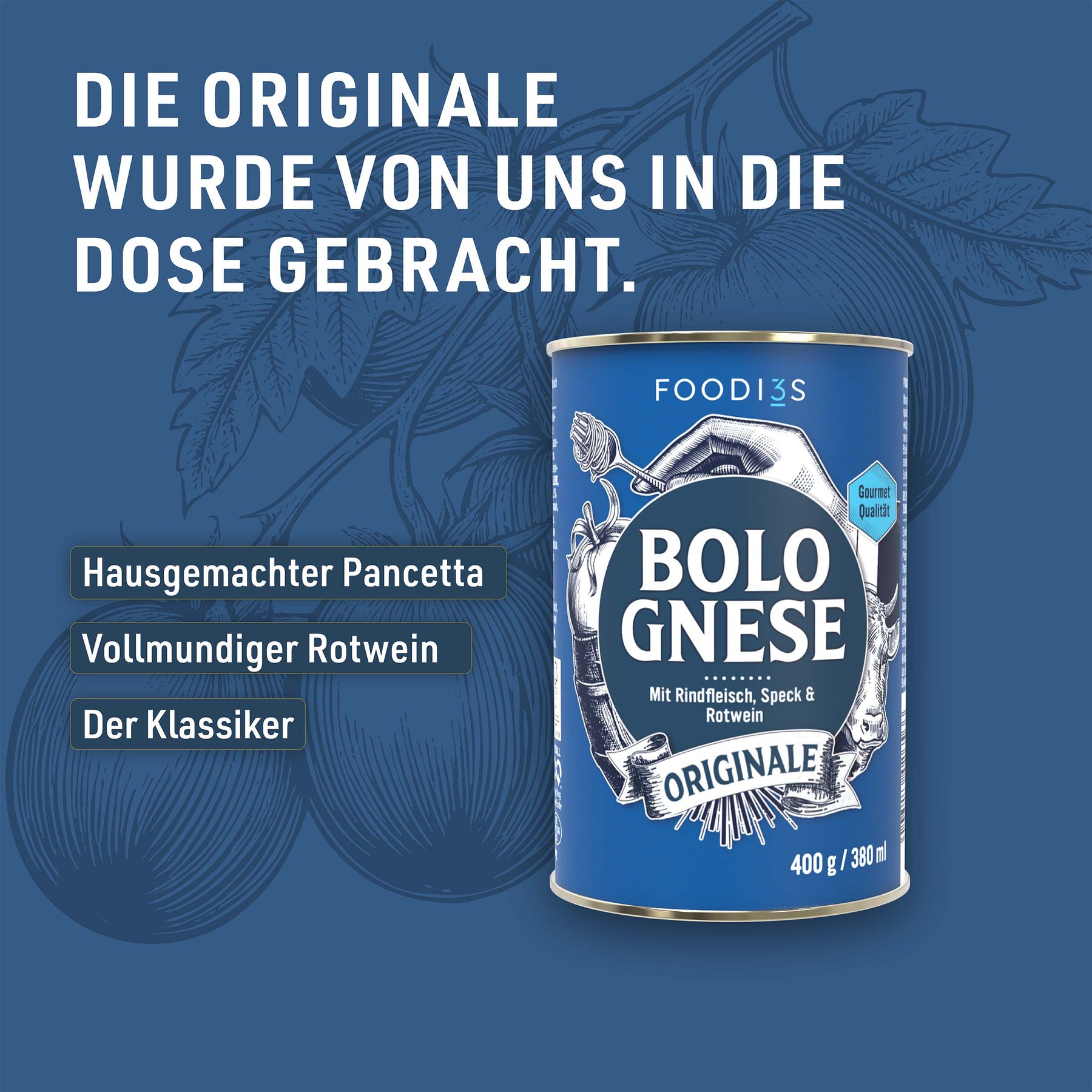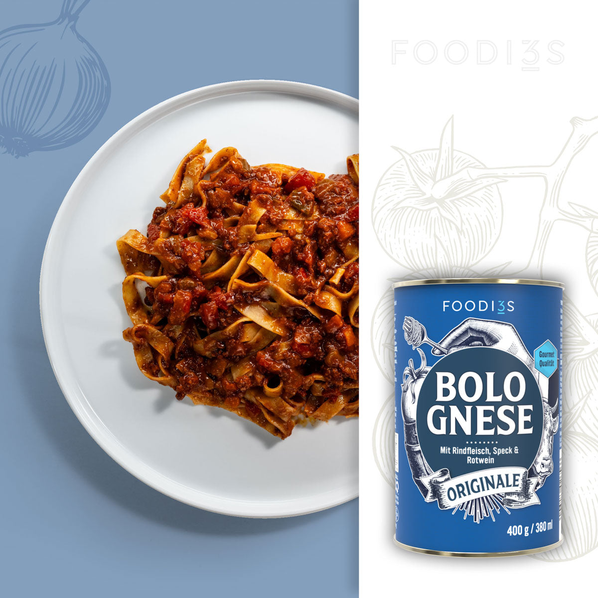 Korrekterweise ist es das Ragu alla Bolognese, was streng geschützt ist von der „Academia Italiana della Cucina“. Hier sind die Grundzutaten und Verhältnisse festgelegt. Wir orientieren uns an der Rezeptur und haben das Original in der Dose gebracht. Denn in dieser wird es nur besser!
