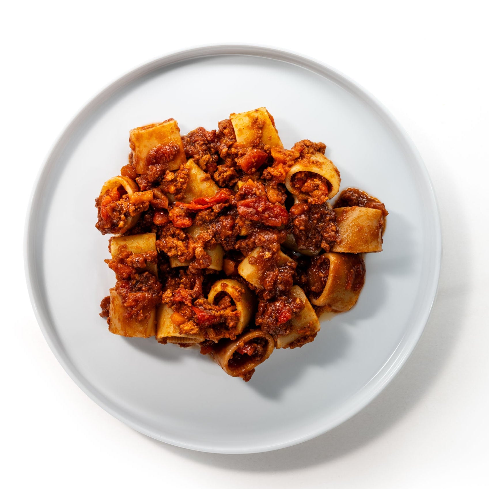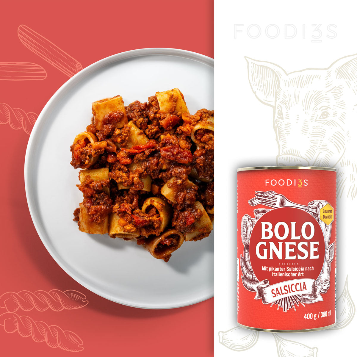 43% Tomaten, 25% Schweinehack angebraten (Schweinefleisch, Wasser, Speisesalz, natürliche Aromen, Dextrose, Sonnenblumenöl), Zwiebeln, STAUDENSELLIRIE, Karotten, natives Olivenöl extra, Wein (enthält SULFITE), Tomatenmark, BUTTER, Meersalz, Stärke, Zucker, Schwarzer Pfeffer, Chili, Knoblauch.